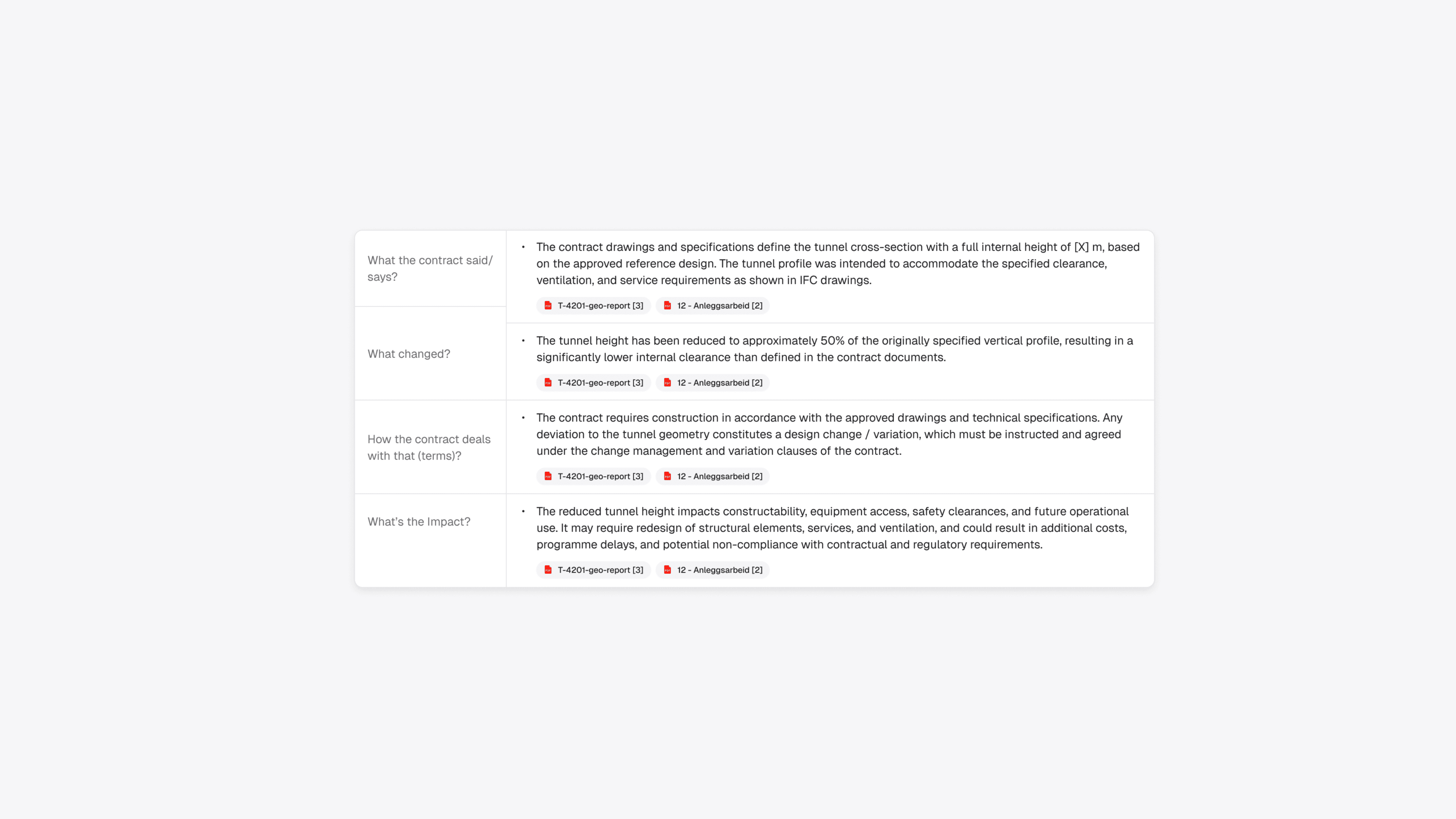 Structured, traceable contractual context for each change or claim helped a team assess more than 340 change cases built from 4,500+ project documents, enabling faster responses and a stronger position.