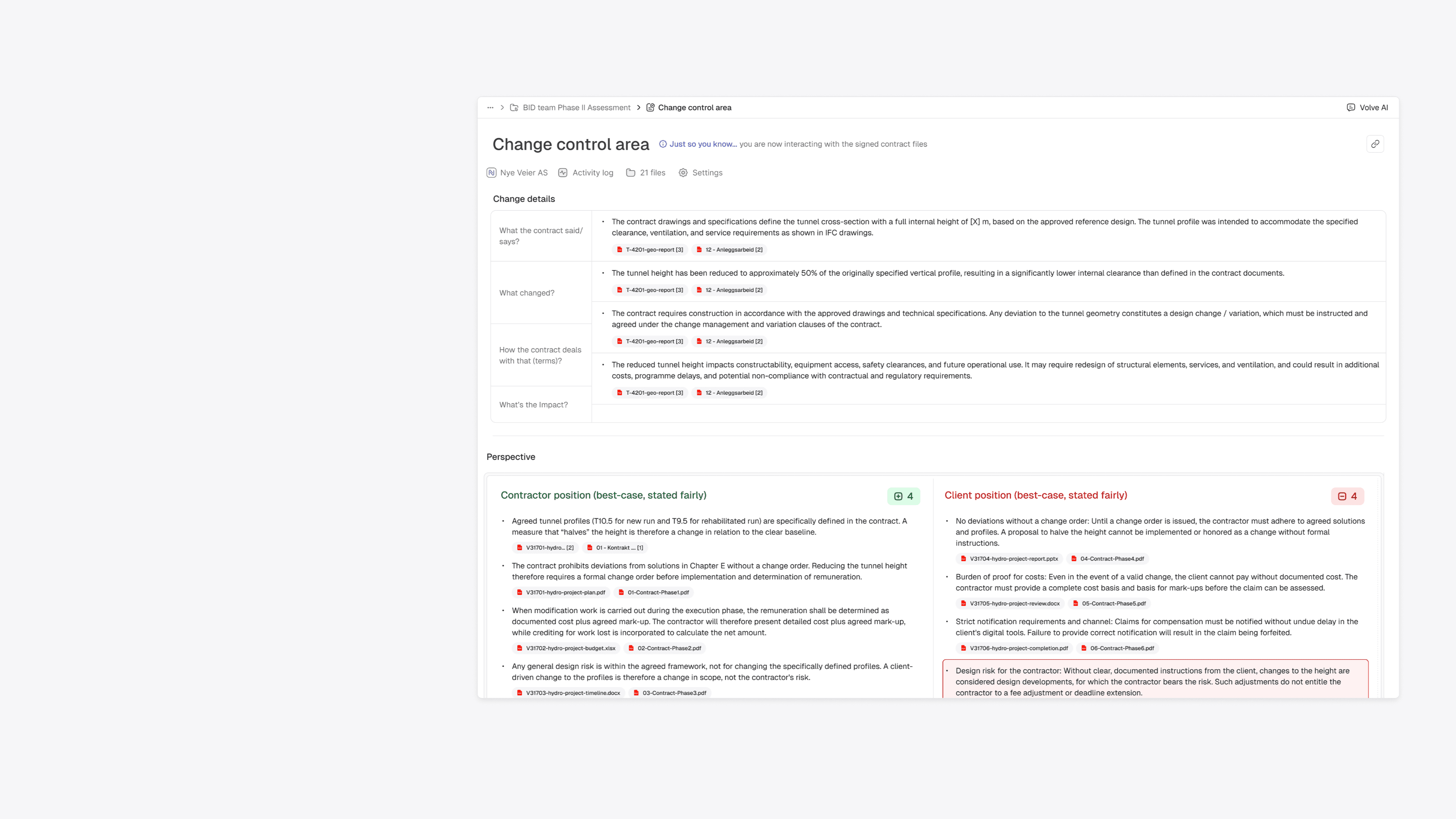 Contracts, specs, tenders, and bid files define risk, responsibility, quality, and cost. Volve turns that unstructured information into structured insight from tender to delivery.